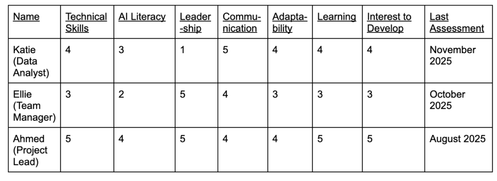 - It’s clear that Ellie (Team Manager) has a lower digital and AI literacy understanding, but is moderately interested in development, which shows how a skills gap can lead to a focused learning and development pathway.