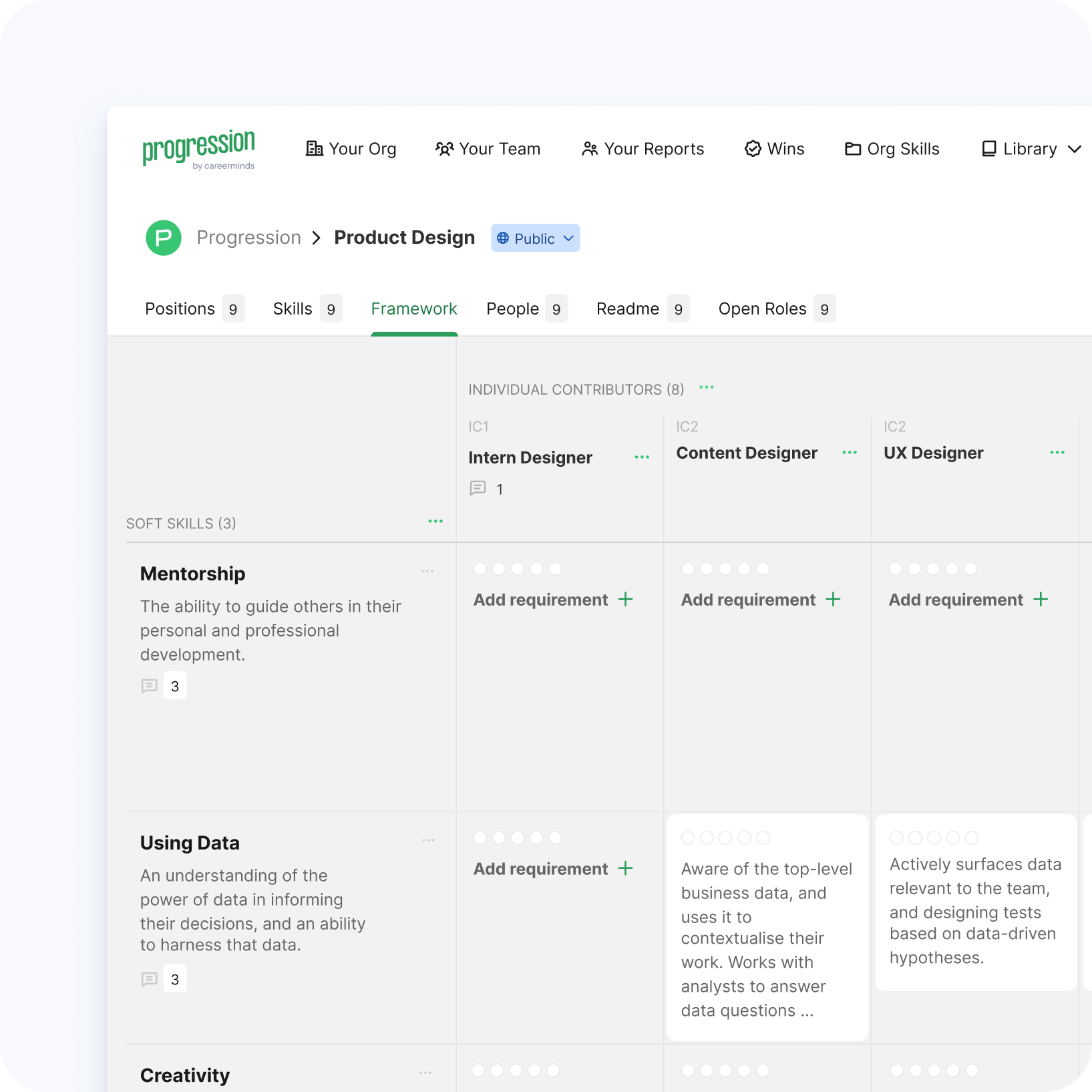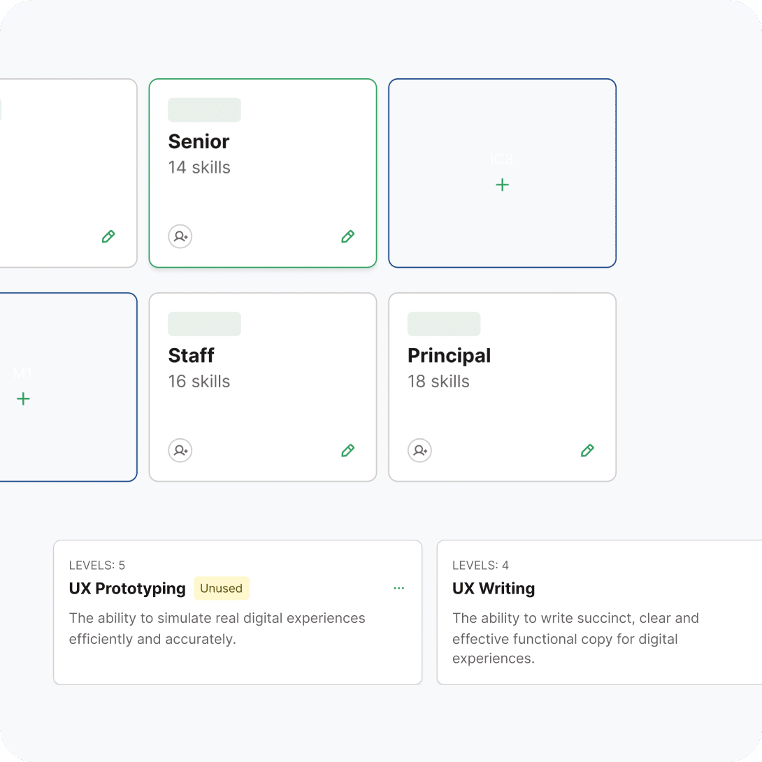 Define transparent career pathways for every employee. Provide clarity with skill libraries and customize everything. Quick-build entire career frameworks with AI.